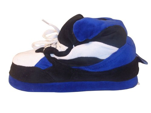 These high top slipper are a great mix of blue, black and white. Happy Feet Slipper are made of 100% polyester and with a 1" foam rubber bottom are the most comfortable slippers you will ever wear.You will not be disappointed with